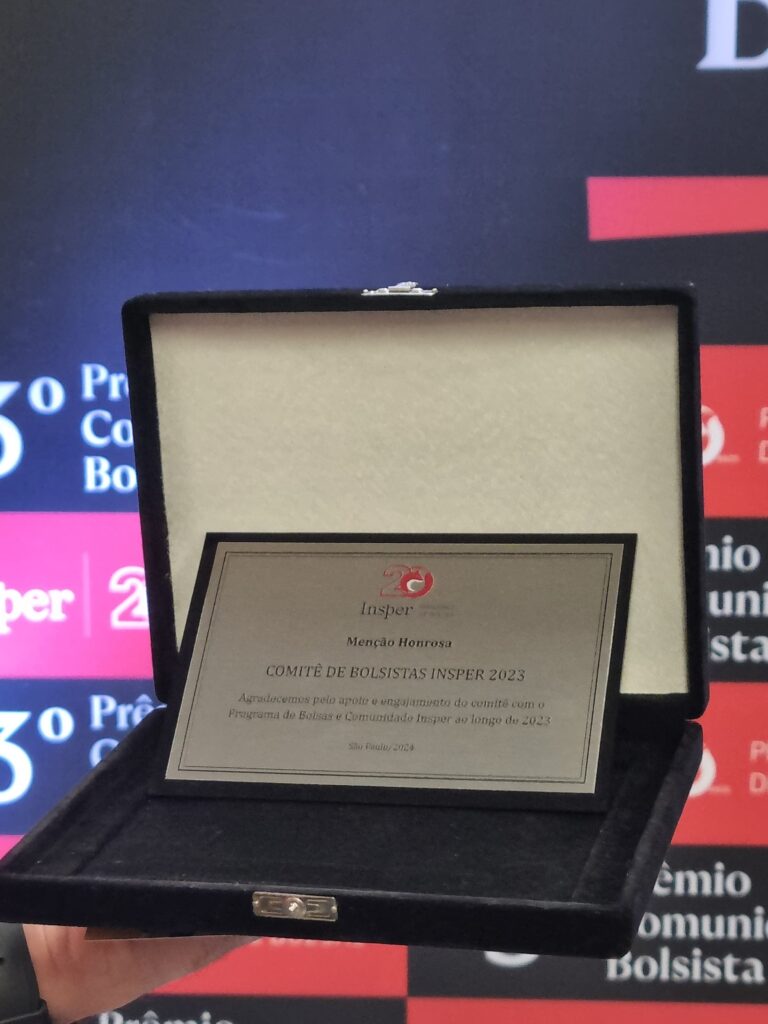 Na edição de 2024 do Prêmio Comunidade Bolsistas do Insper (3ª edição), os ex-presidentes Lorran (Gestão 2022) e Amanda (Gestão 2023) foram homenageados com uma menção honrosa por terem dado continuidade, com sucesso, ao Comitê de Bolsistas e por toda contribuição junto ao Programa de Bolsas do Insper em 2023.