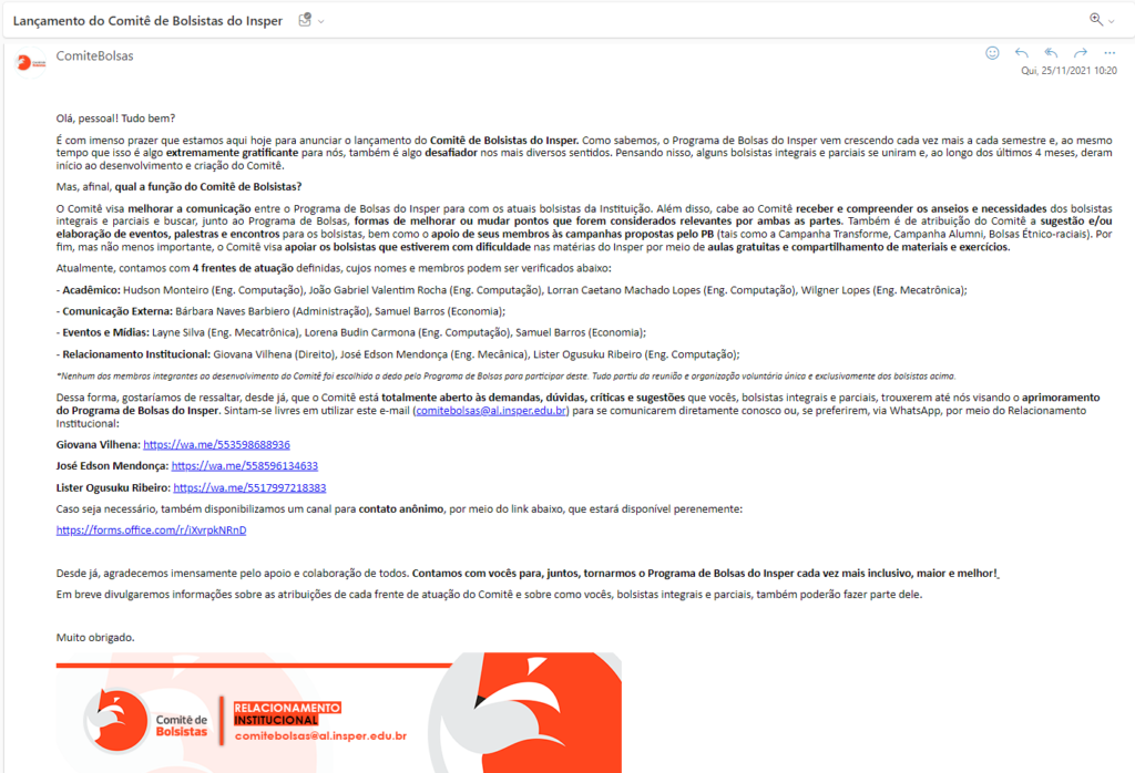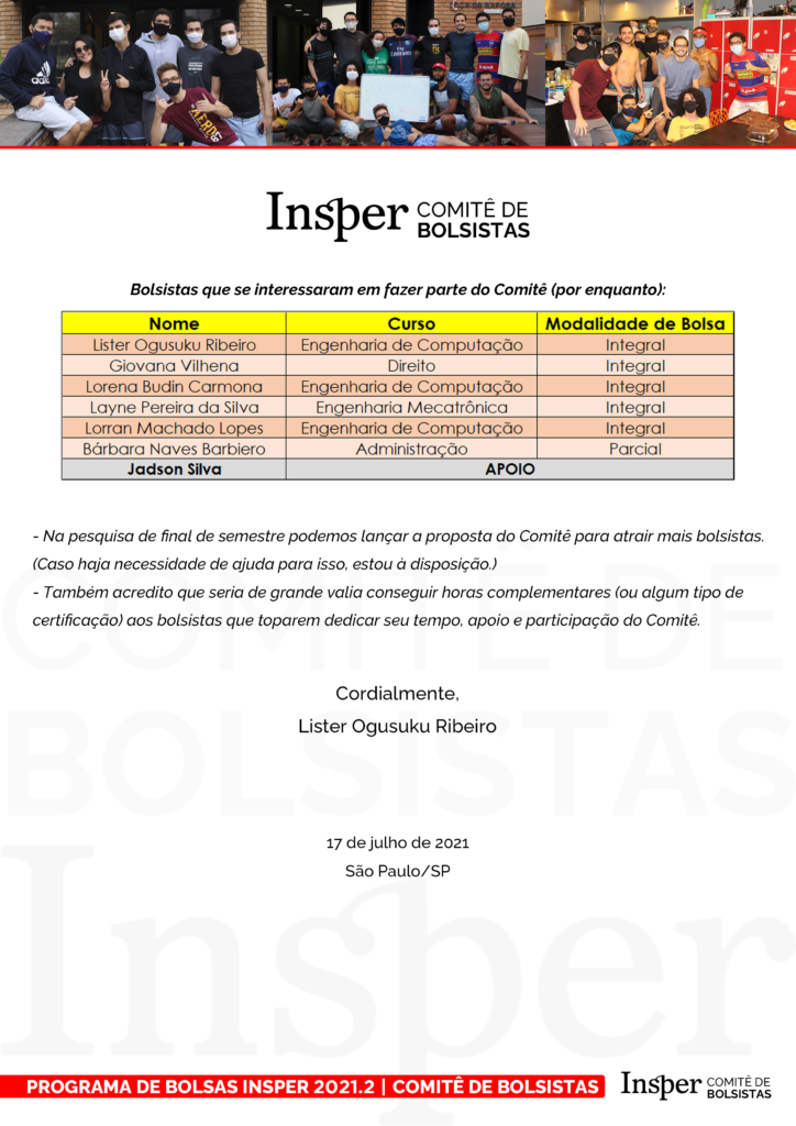 No dia 25 de junho de 2021, foi enviado por Lister (na época no segundo semestre da Eng. de Computação) a seguinte carta ao Programa de Bolsas do Insper propondo a criação de algum tipo de “Diretório de Apoio ao Bolsista”: