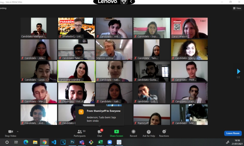 - No dia 21 de julho de 2021, foi feito um “trote” de boas-vindas aos novos bolsistas da graduação. O Programa de Bolsas convidou os membros do Comitê e outros bolsistas para se passarem por avaliadores dos candidatos e, no meio da ligação, todos foram direcionados à sala principal do Zoom para receberem a notícia de que, na verdade, o Insper havia concedido a bolsa de estudos para todos ali presentes.