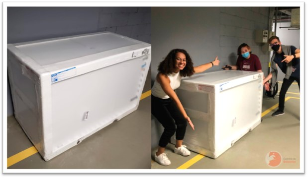Na imagem a seguir deixamos registrado o dia em que o novo freezer chegou na Toca e os líderes do residencial na época nos convidaram para prestigiar esse momento (da esquerda para a direita: Alexia, Giovana e Lister):