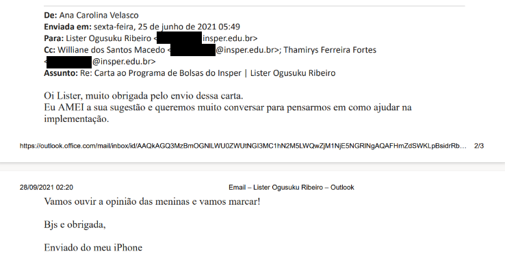 Poucas horas após o envio da carta, a Carol (Gerente de Relacionamento Institucional do Insper) respondeu o e-mail elogiando a ideia e propondo uma conversa para decidir como tudo deveria ser implementado: